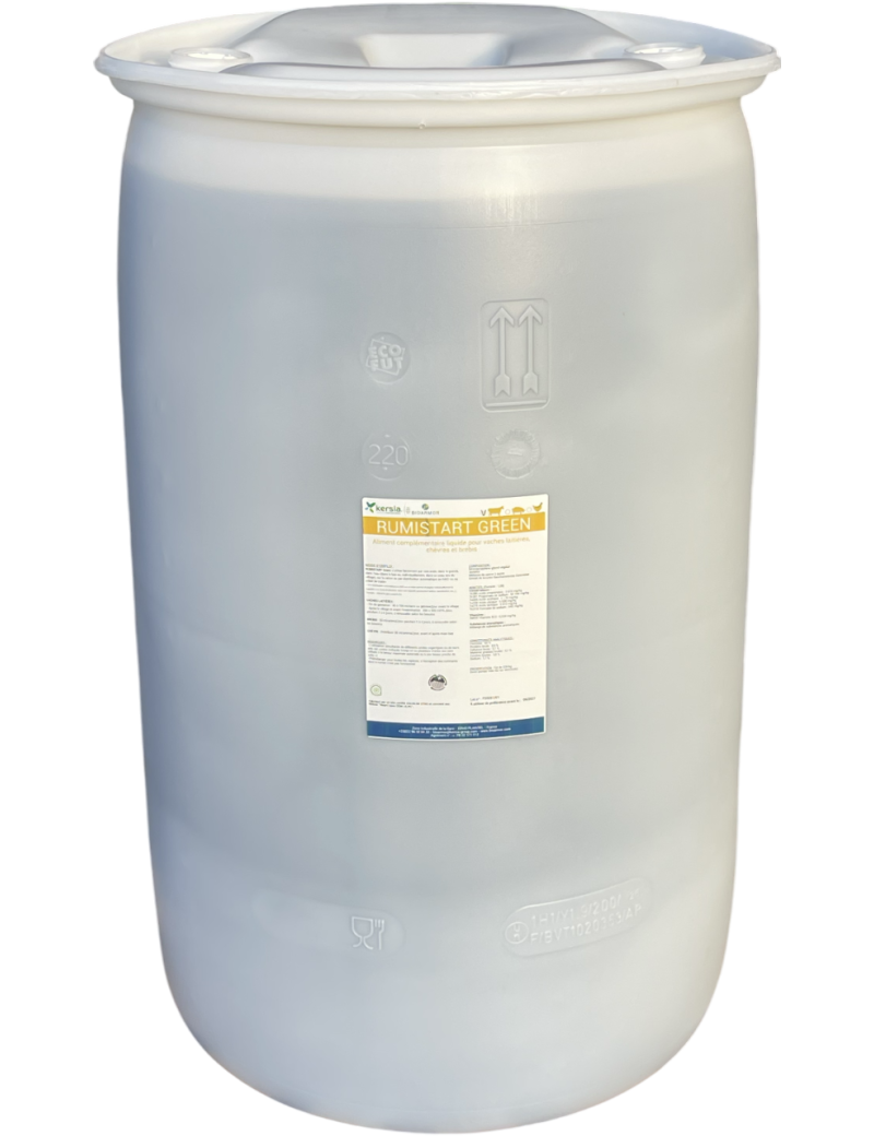 RUMISTART GREEN : produit liquide à base de propylène glycol d’origine végétale, acides gras volatils, sorbitol, cobalt et extraits de levures.